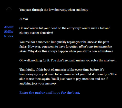 An early-game screenshot from the current alpha of my first game, Detectivania! I’m creating it to teach myself Twine, to answer the question of “what if you had a Metroidvania that was a conversation game instead of a platformer,” and to prove to myself that I can make games instead of just talking about them.