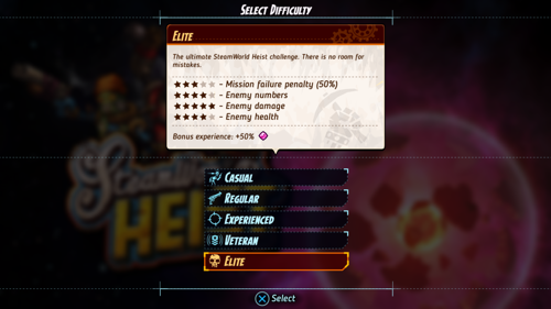 I find this sort of thing super frustrating and a clear indication that the game doesn’t understand what difficulty settings are for. They’re for letting players opt in to an experience appropriate to their capabilities and interest. By having higher difficulties be more punishing but award more experience, SteamWorld Heist conflates this with a risk/reward trade-off that really should be handled separately. It’s now less clear what difficulty level to pick - a player wishing to reduce the amount of time and effort required by combat may now have to grind through more encounters, while a highly skilled player may find the higher difficulties actually easier.
